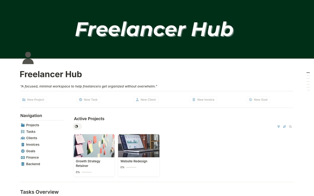 A simple and efficient Notion dashboard designed for freelancers who want to stay organized without the clutter. Whether you're a designer, writer, developer, or consultant, this free version gives you just what you need to manage your business with clarity.