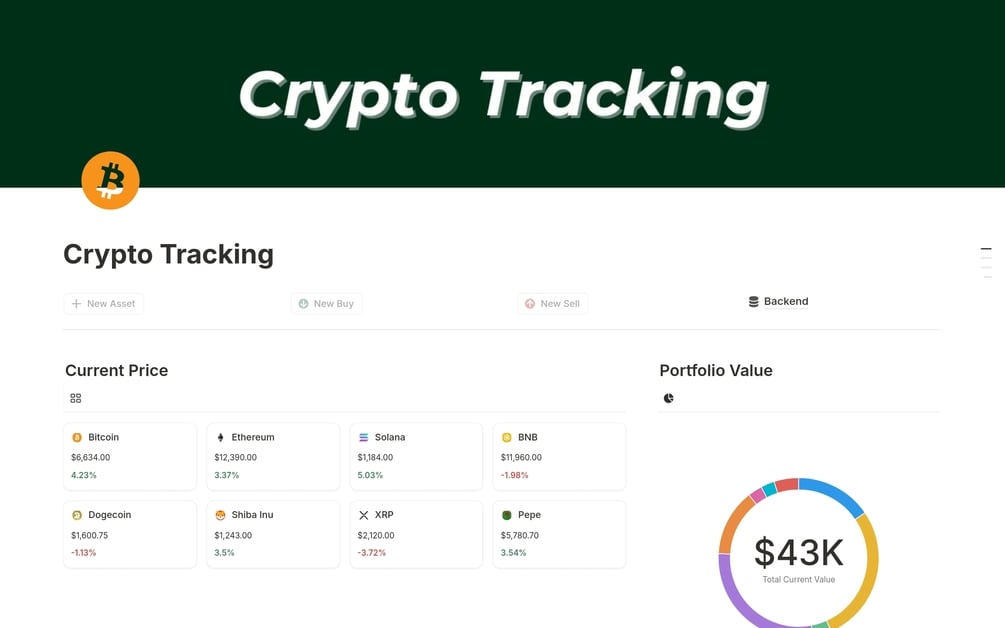• 📊 Assets Database – Track all your cryptocurrencies in one place, including coin name, quantity, current value, and portfolio allocation.