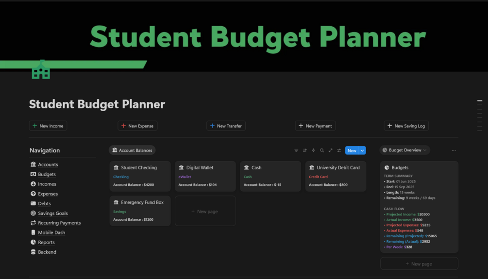 The Student Budget Pro template is a complete, ready-to-use financial system that helps students track their income, manage their spending, and stay in control of their money over weeks, months, or full academic terms.