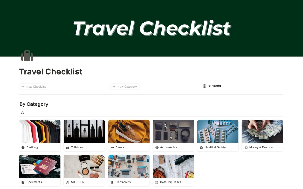 Plan smarter and travel stress-free with this simple but powerful Notion checklist system. Organize your tasks by category (Packing, Documents, Booking, etc.) and check off everything from start to finish — before, during, and after your trip.