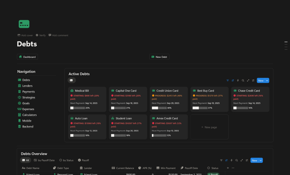 - Debt Payments β Schedule and track every payment, including due dates, frequency, and completion status.